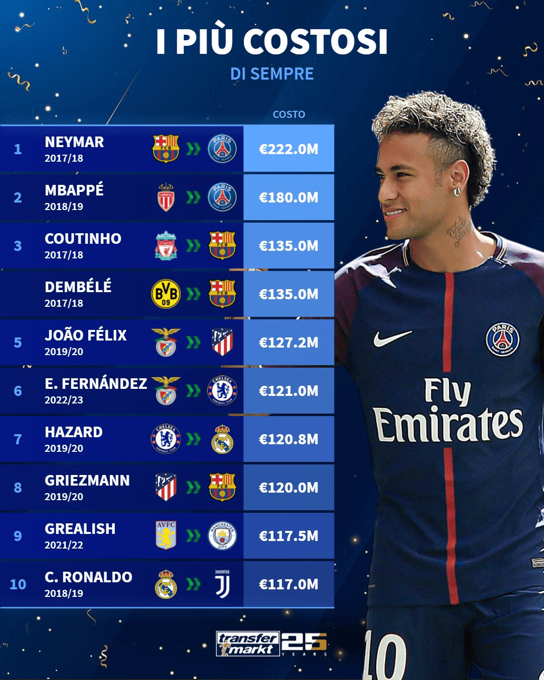 虎扑06月13日讯 今天是德国转会市场网站创办25周年的纪念日。德转也在今天发布了多个纪念性盘点榜单。其中本篇为历史最贵交易TOP10。
